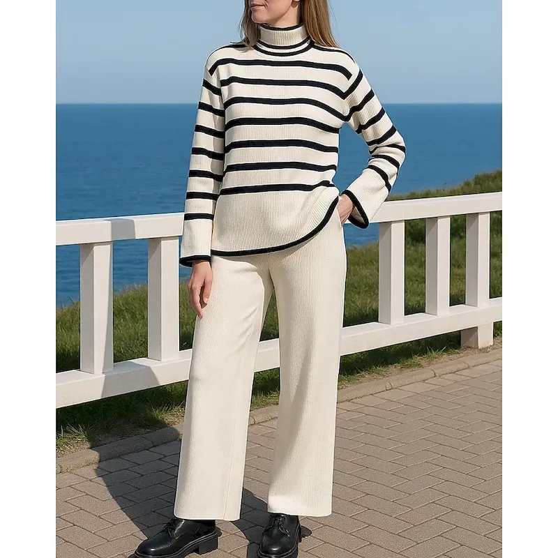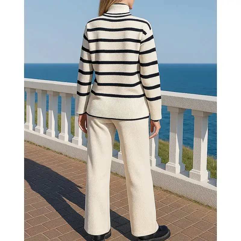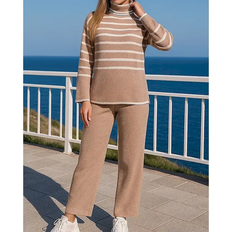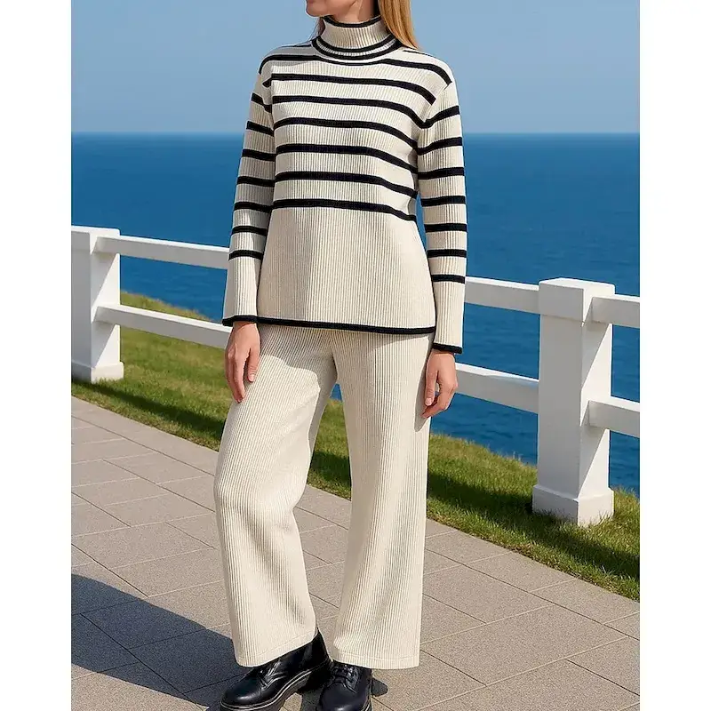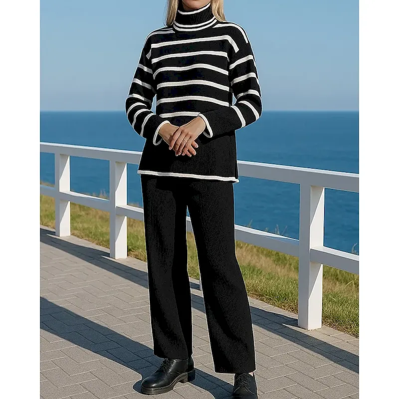 Women’s Knitted Wide-leg Pants Turtleneck Sweater Lounge Suits Striped Clothing Suit Fall Black White Vocation Outdoor Travel Lightweight Fashion Long Sleeve Sport Activewear Micro-elastic Regular Fit
