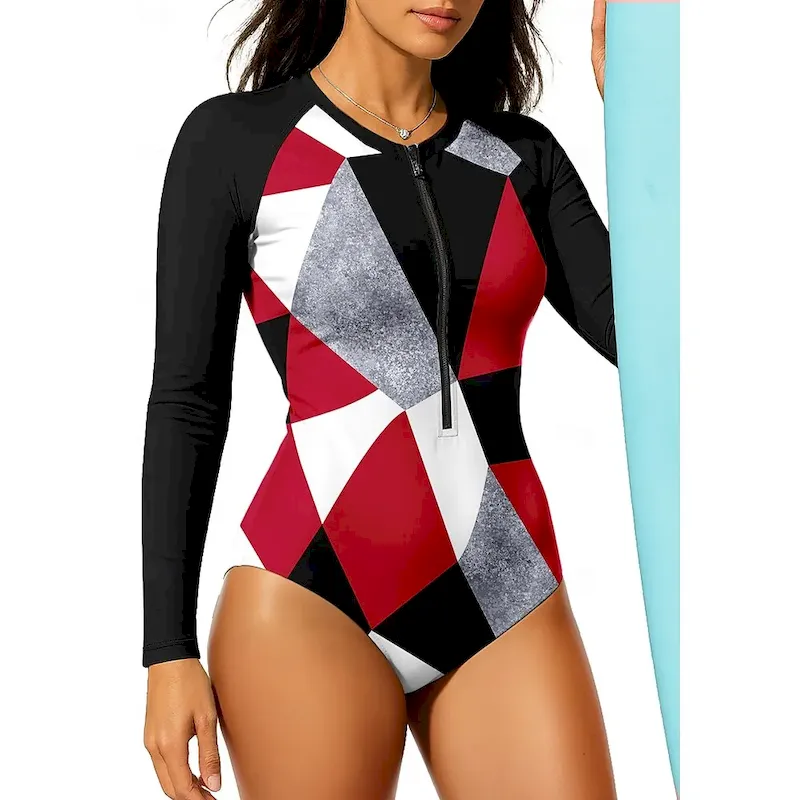 Women’s Standard Regular Rash Guard Geometry UPF50+ UV Protection Quick Dry Long Sleeve Front Zip Surfing Canoeing Beach Summer